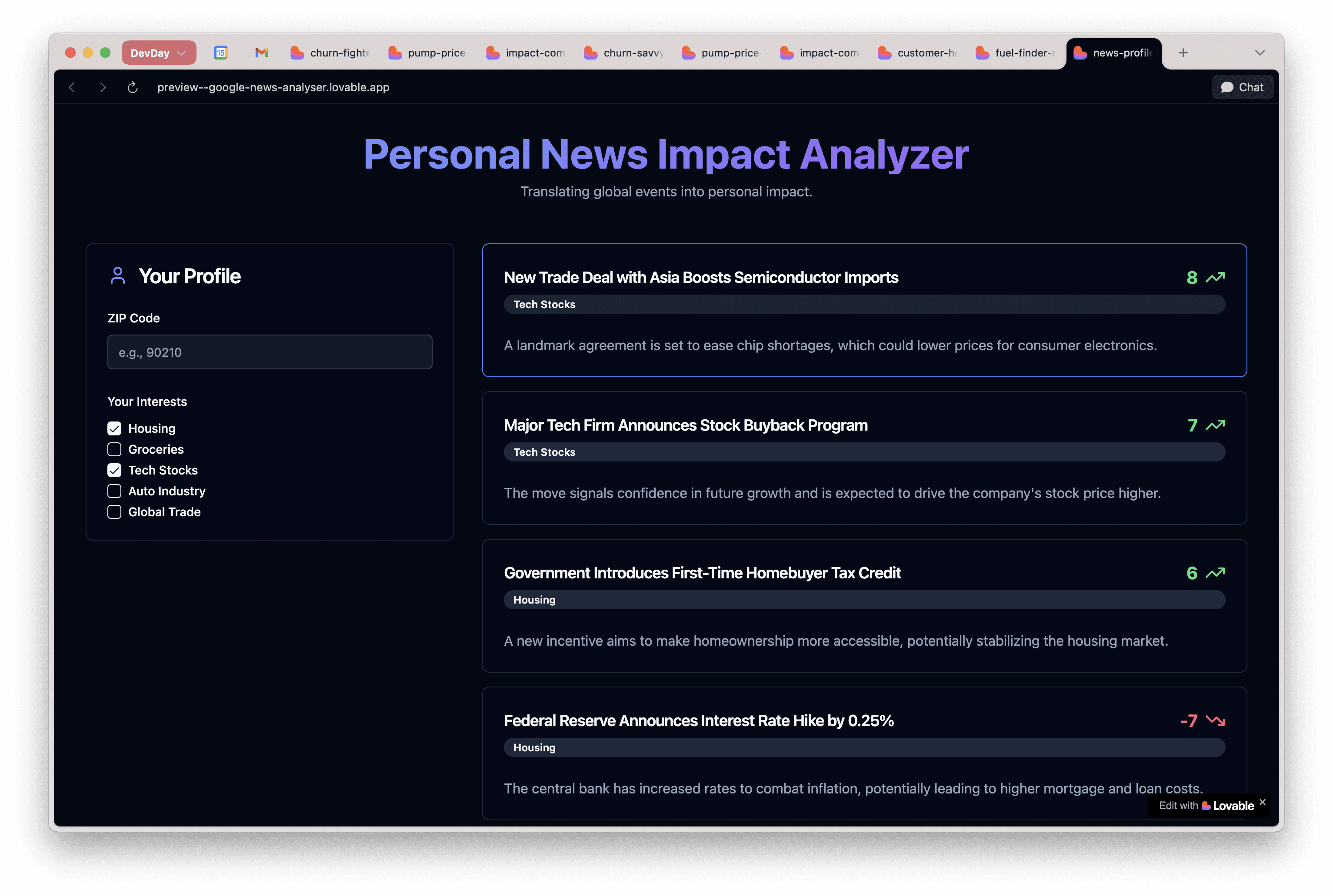 News Impact Correlation: ML engine that maps news events to personal impact categories (housing costs, food prices, job market, investment effects, supply chain disruptions)